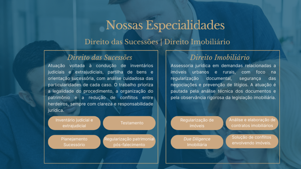 Atuação exclusiva em Direito das Sucessões e Direito Imobiliário, com foco em inventários, partilhas e regularização de bens.